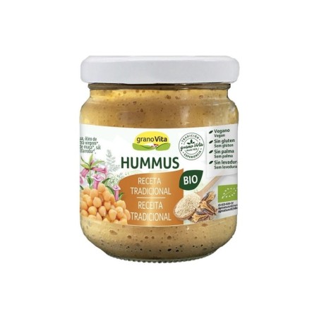 Hummus Tradicional Bio 175 gramos Granovita. Hummus de garbanzo aderezado con ajo y pimienta de cultivo ecológico.