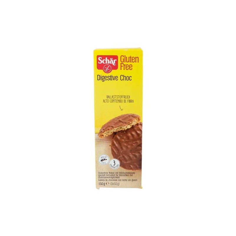 Galletas Digestive Choc SinGluten de Dr. Schar es una galleta con chocolate con leche. La perfecta combinación de una galleta rica en fibra con el más fino chocolate con leche.