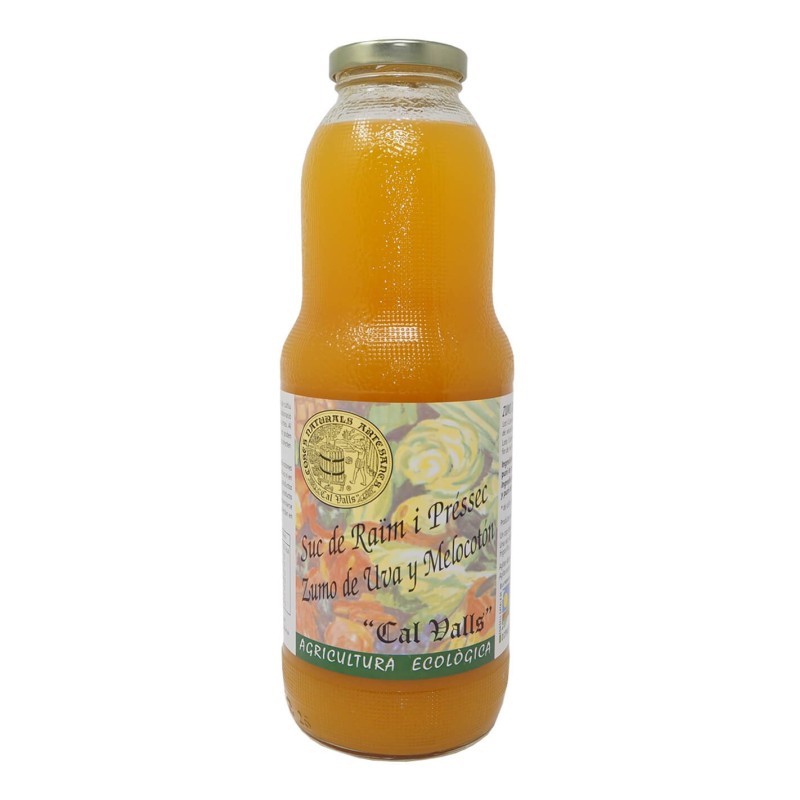 Zumo Melocotón y Uva Bio de Cal Valls es un producto de cultivo ecológico, elaborado a partir de melocotones frescos y uvas.