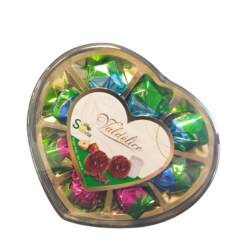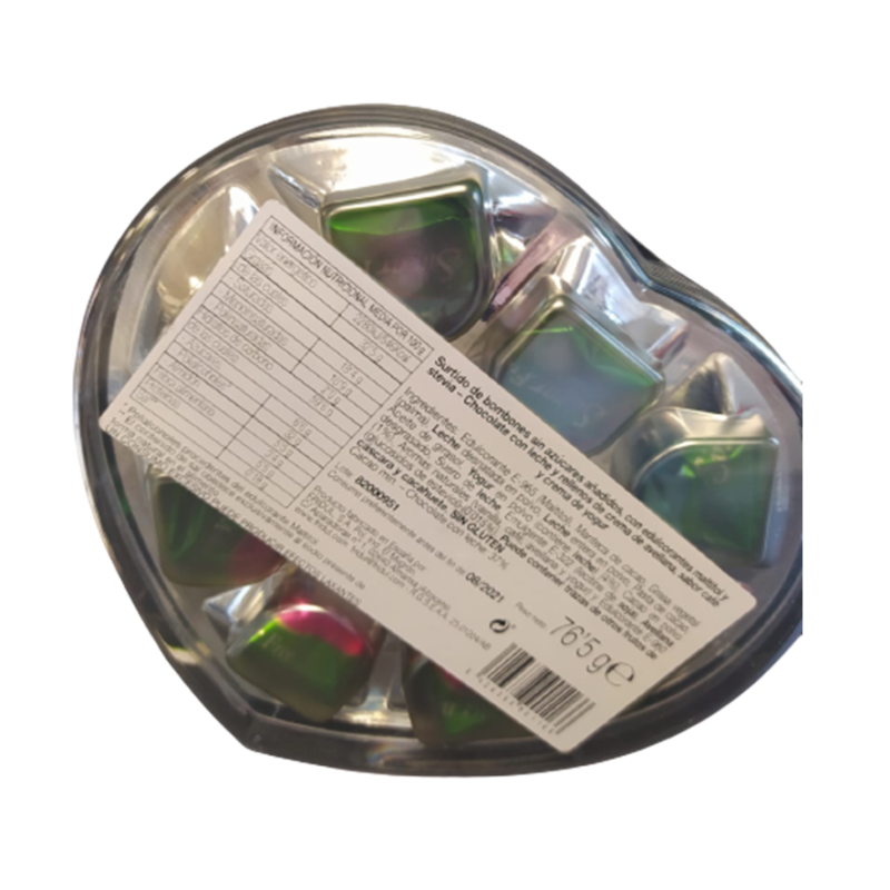 Caja corazón con surtido de bombones sin azúcares añadidos, edulcorado con stevia y matitiol. Sin Gluten. 3 sabores: Chocolate con leche y relleno de crema de avellana, sabor café y crema de yogur.
