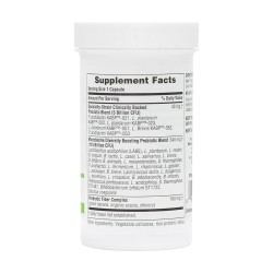 Mezcla de bacterias beneficiosas que contribuyen a la diversidad del microbioma (115.000 millones de UFC) 340 mg, Complejo de fibras 160 mg, Cepas específicas de bacterias beneficiosas (5.000 millones UFC) 40 mg. Ingredientes: Mezcla de bacterias beneficiosas que contribuyen a la diversidad del microbioma (Lactobacillus acidophilus, Lactobacillus plantarum, Lactobacillus reuteri, Bifidobacterium longum, Bifidobacterium lactis, Lactobacillus casei, Lactobacillus salivarius, Lactobacillus brevis, Bifidobacterium bifidum, Bifidobacterium animalis , Leuconostoc mesentoroides, Streptococcus thermophilus, Pediococcus acidilactici, Lactobacillus fermentum, Lactobacillus rhamnosus, Lactobacillus gasseri, Lactobacillus paracasei, Bifidobacterium breve, Lactococcus lactis, Lactobacillus bulgaricus, Lactobacillus helveticus, Lactobacillus crispatus, Bifidobacterium adolescentis , Bifidobacterium infantis, Pediococcus pentosaceus, Lactobacillus acidophilus DDS-1, Streptococcus thermophilus ST1447, Bifidobacterium bifidum ST1722, Bacillus coagulans), Complejo de fibras (plátano verde (Musa paradisiaca), goma de acacia (Acacia senegal), raíz de achicoria (Cichorium intybus)), Agente de recubrimiento (celulosa vegetal), proteína de arroz (Oryza sativa), Cepas específicas de Bacterias Beneficiosas (Pediococcus acidilactici KABP-021, Lactobacillus plantarum KABP-022, Lactobacillus plantarum KABP-023, Lactobacillus plantarum KABP -051, Lactobacillus brevis KABP-052, Pediococcus acidilactici KABP -053, Antiaglomerante (dióxido de silicio). UFC: Unidades Formadoras de Colonias.