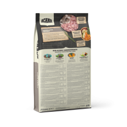 Pollo deshuesado fresco (16 %), pollo deshidratado (14 %), pavo deshidratado (14 %), lentejas rojas, guisantes verdes enteros, fibra de guisante, menudillos de pollo frescos (hígado, corazón, riñón) (5 %), arenque del atlántico deshidratado (5 %), huevos enteros frescos (4 %), lenguado entero fresco (4 %), alfalfa curada al sol (4 %), frijoles (4 %), lentejas verdes, guisantes amarillos enteros, grasa de pollo (1 %), aceite de arenque (1 %), cartílago de pollo fresco (1 %), alga marrón, calabacín fresca, calabaza, chirivías frescas, hojas de col rizada, espinacas frescas, mostaza parda, hojas de nabo, zanahorias frescas, manzanas frescas red delicious, peras barlett frescas, hígado de pollo liofilizado, hígado de pavo liofilizado, arándanos, arándanos agrios, raíz de achicoría, curcuma, cardo mariano, raíz de bardana, lavanda, raíz de malvavisco, fruto de rosa. ADITIVOS (por kg): Aditivos nutricionales: E6 (Zinc): 100 mg. Aditivos zootécnicos: Enterococcus faecium.