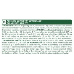 Ingredientes: carnes y subproductos animales (5% pollo, 2% cordero, 1% cerdo), cereales (entre otros, 4% trigo integral y 4% maíz), subproductos de origen vegetal, aceites y grasas, sustancias minerales.