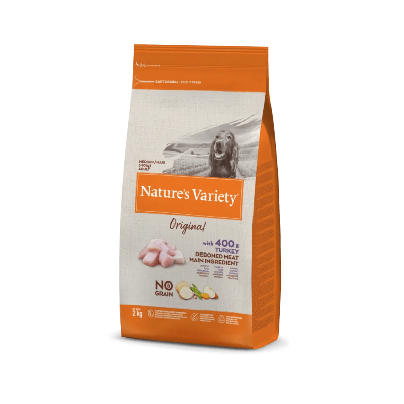 Nature’s Variety Original Medium/Maxi Pavo es un pienso para perros adultos de raza mediana y grande elaborado con una combinación única de ingredientes naturales. Su fórmula excluye los cereales y el gluten para mejorar su aceptación y favorecer las digestiones. Además, esto hace que se convierta en un alimento ideal para perros con alergias o intolerancias a los granos. Su receta 100% natural también es la mejor para los perros más sensibles debido a no utilizar componentes de baja calidad que les sienten mal.