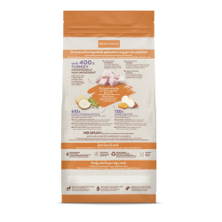 Carne de pavo deshuesada * (20%), proteína deshidratada de pavo (13%), guisantes deshidratados* (12,5%), patata deshidratada* (12%), almidón de guisante*, proteína deshidratada de pollo (8%), grasa avícola* (6,5%), garbanzos deshidratados* (6%), hidrolizado de proteína (4%), fibra de guisante*, raíz de achicoria deshidratada*, sustancias minerales, zanahoria deshidratada* (0,5%, equivalente a un 4% de zanahoria fresca), manzana deshidratada* (0,3%, equivalente a un 2% de manzana fresca)., *Ingredientes naturales.