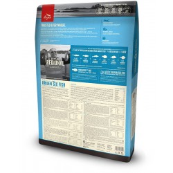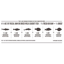 Sardina fresca del Pacífico entera (26%), merluza del Pacífico fresca (9%), caballa entera fresca del Pacífico (8%), lenguado entero fresco (5%), raya de roca fresca entera (5%), lenguadina entera fresca (5%), caballa entera (deshidratada, 5%), arenque entero (deshidratado, 5%), bacaladilla entera (deshidratada, 5%), aceite de arenque (5%), bacalao de Alaska (deshidratado, 5%), lentejas rojas, lentejas verdes, guisantes verdes, aceite de girasol (prensado en frío), sardina entera, (deshidratada, 1,5%), fibra de lentejas, garbanzos, guisantes amarillos, alubias pintas, hígado de bacalao (liofilizado), calabaza fresca, calabaza moscada fresca, calabacín fresco, chirivías frescas, zanahorias frescas, manzanas frescas, peras frescas, col fresca, espinacas frescas, hojas de remolacha fresca, hojas de nabo fresco, alga kelp marrón, arándanos agrios enteros, arándanos enteros, bayas de saskatoon enteras, raíz de achicoria, cúrcuma, cardo mariano, raíz de bardana, lavanda, raíz de malvavisco, rosa mosqueta.