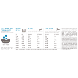 La energía metabolizable es 3.860 kcal/kg (465 kcal por taza de 250 ml/120 g) con una distribución de calorías para favorecer una condición física óptima: 39% proveniente de proteínas, 19% de vegetales y frutas y 42% de grasas.